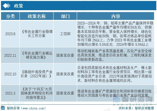 為了實(shí)現(xiàn)有色金屬行業(yè)的穩(wěn)定增長(zhǎng),我國(guó)政府部門發(fā)布了一系列政策及發(fā)展規(guī)劃。2023年8月,工信部發(fā)布《有色金屬行業(yè)穩(wěn)增長(zhǎng)工作方案》,其中提到2023年-2024年我國(guó)有色金屬的發(fā)展目標(biāo)為銅、鋁等主要產(chǎn)品產(chǎn)量保持平穩(wěn)增長(zhǎng),十種有色金屬產(chǎn)量年均增長(zhǎng)5%左右,供需基本實(shí)現(xiàn)動(dòng)態(tài)平衡。營(yíng)業(yè)收入保持增長(zhǎng),綠色化智能化改造升級(jí)加快,銅、鉛等冶煉品單位能耗年均下降2%以上。力爭(zhēng)2023年有色金屬工業(yè)增加值同比增長(zhǎng)5.5%左右,2024年增長(zhǎng)5.5%以上。2022年11月,國(guó)家發(fā)改委在《有色金屬行業(yè)碳達(dá)峰實(shí)施方案》中提出推動(dòng)機(jī)械裝備產(chǎn)業(yè)高質(zhì)量發(fā)展、石化產(chǎn)業(yè)安全綠色高效發(fā)展,推進(jìn)老舊農(nóng)業(yè)機(jī)械、工程機(jī)械及老舊船舶更新改造。2022年10月,國(guó)家發(fā)改委在《鼓勵(lì)外商投資產(chǎn)業(yè)目錄(2022年版)》更強(qiáng)調(diào)對(duì)于高新技術(shù)、新材料在有色金屬領(lǐng)域的應(yīng)用。2021年3月,國(guó)家發(fā)改委提出《關(guān)于“十四五”大宗固體廢棄物綜合利用的指導(dǎo)意見》,其中強(qiáng)調(diào)推進(jìn)有色金屬礦產(chǎn)資源綜合利用和有價(jià)梯度回收,推動(dòng)大宗固廢與有色金屬行業(yè)等產(chǎn)業(yè)協(xié)同發(fā)展。