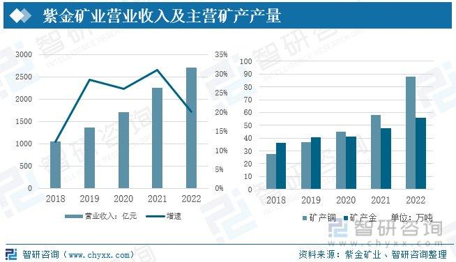 紫金礦業(yè)是一家在全球范圍內(nèi)從事銅、金、鋅、鋰等金屬礦產(chǎn)資源勘查、開發(fā)及工程設(shè)計(jì)、技術(shù)應(yīng)用研究的大型跨國(guó)礦業(yè)集團(tuán),是中國(guó)控制金屬礦產(chǎn)資源最多的企業(yè)之一。紫金礦業(yè)營(yíng)業(yè)收入近年來保持高速增長(zhǎng)的趨勢(shì),2022年紫金礦業(yè)營(yíng)業(yè)收入為2703億元,較2021年增加20%。2019年之前,紫金礦業(yè)礦產(chǎn)金的產(chǎn)量大于礦產(chǎn)銅的產(chǎn)量,2020年開始,紫金礦業(yè)開始大力發(fā)展礦產(chǎn)銅,礦產(chǎn)銅的產(chǎn)量實(shí)現(xiàn)高速增長(zhǎng),2022年,礦產(chǎn)銅的產(chǎn)量為88萬噸,較2021年增加30萬噸,同比增加51.72%。