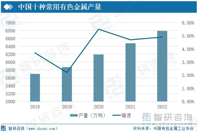 據(jù)中國(guó)有色金屬工業(yè)協(xié)會(huì)發(fā)布的數(shù)據(jù)統(tǒng)計(jì),受下端需求拉動(dòng)及消費(fèi)量增加的影響,我國(guó)十種常見有色金屬的產(chǎn)量呈現(xiàn)逐年增加的趨勢(shì),且增速較高。2022年十種常用有色金屬產(chǎn)量為6793.6萬噸,較2021年同比增加4.90%。