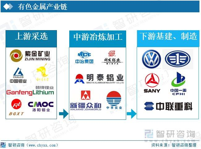 有色金屬產(chǎn)業(yè)鏈的上游主要是礦產(chǎn)資源的開采,主要的開采有色金屬的企業(yè)有紫金礦業(yè)、中國(guó)鋁業(yè)、銅陵有色、贛鋒鋰業(yè)等,產(chǎn)業(yè)鏈的中游主要是有色金屬的冶煉及加工,目前我國(guó)冶煉加工端一體化程度較高,主要代表企業(yè)有中冶集團(tuán)、閩發(fā)鋁業(yè)、明泰鋁業(yè)、新疆眾和等,產(chǎn)業(yè)鏈下游為基礎(chǔ)設(shè)施的建設(shè)、機(jī)械制造等,主要的代表企業(yè)有中國(guó)一汽、上海大眾、三一重工等。