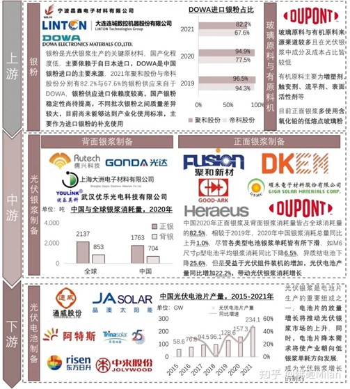 光伏銀漿處于整個產(chǎn)業(yè)鏈的中游,其上游是銀粉、玻璃氧化物及有機載體企業(yè),下游是光伏電池片生產(chǎn)商。其中,銀粉是導(dǎo)電相,主要作用是導(dǎo)電,銀粉質(zhì)量的優(yōu)劣直接影響電極材料的體電阻、接觸電阻等;玻璃氧化物是粘結(jié)相,作用是導(dǎo)電膜層介質(zhì)、連接導(dǎo)電相和基底,其自身成分比例和整體在銀漿中的含量過高會導(dǎo)致銀漿導(dǎo)電性變差,過低無法滲透入鈍化層和硅襯底形成導(dǎo)電接觸;有機載體是有機物和部分液體組成,主要作用是導(dǎo)電相和粘結(jié)相運載體,控制漿料的流動性。光伏銀漿供給主要受中游企業(yè)產(chǎn)量和上游銀粉供應(yīng)的影響,需求受下游硅基光伏電池片產(chǎn)量的影響。
