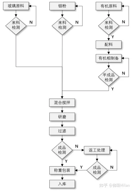正面銀漿的生產(chǎn)工藝為:將銀粉、玻璃粉(或樹脂)、有機相等物質(zhì)進行配料,隨后放入機械設(shè)備內(nèi)混合攪拌、研磨,控制攪拌、研磨工藝參數(shù),過濾泄出銀漿,產(chǎn)品性能檢查、包裝、入庫等。