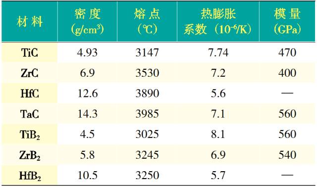 碳化物超高溫陶瓷具有高熔點、高強度、高硬度及良好的化學穩(wěn)定性,是應用廣泛的超高溫陶瓷材料,目前常用的碳化物超高溫陶瓷主要包括碳化硅(SiC)、碳化鋯(ZrC)、碳化鉭(TaC)和碳化鉿(HfC)。碳化鉿(HfC)、碳化鋯(ZrC)和碳化鉭(TaC)的熔點與其氧化物相比高得多,不經歷任何固相相變,具有較好的抗熱震性能,在高溫下仍具有較高的強度。但是,這類碳化物超高溫陶瓷的斷裂韌性和抗氧化性相對較低,通常采用纖維進行增強增韌。