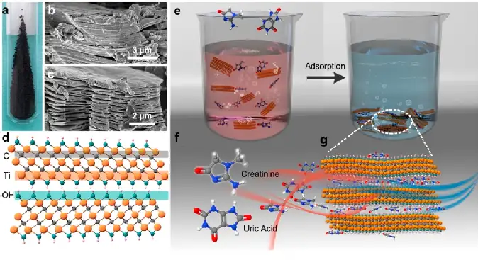 美國(guó)德雷塞爾大學(xué)Yury Gogotsi教授團(tuán)隊(duì)[6]將Ti3C2Tx,一種已知能有效吸附尿素的MXenes材料,用于從水溶液和透析液中去除肌酐和尿酸,最大吸附量分別為45.7和17.0 mg g-1。作者系統(tǒng)地分析和模擬了吸附動(dòng)力學(xué)、等溫線和熱力學(xué),從而確定了限速步驟和吸附機(jī)理,并設(shè)計(jì)了一個(gè)裝有Ti3C2Tx的固定床柱,以進(jìn)一步評(píng)估連續(xù)流體流動(dòng)條件下的吸附性能,反映連續(xù)腎臟替代治療方法的條件。該研究表明,Ti3C2Tx具有作為透析液再生的有效吸附劑的潛力,通過(guò)去除過(guò)濾的毒素加速透析液再生,實(shí)現(xiàn)更便攜的透析設(shè)備制造,體現(xiàn)出MXenes材料在醫(yī)藥領(lǐng)域的應(yīng)用潛力(圖8)。