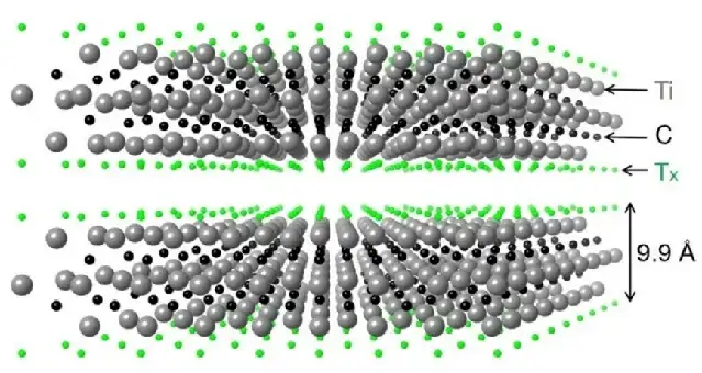 因此,在氫氟酸溶液中,MAX相的A原子層易于被刻蝕,剩下M與X原子層形成二維Mn+1Xn原子晶體,為了強(qiáng)調(diào)它們是由MAX相剝離而來(lái),并具有與石墨烯(Graphene)類(lèi)似的二維結(jié)構(gòu),將它們統(tǒng)一命名為MXene。根據(jù)各種過(guò)渡金屬(如Ti,Mo,V,Cr及其與C和N合金)的組合,材料科學(xué)家已經(jīng)確定或預(yù)測(cè)了成百上千種不同MXenes的穩(wěn)定相。