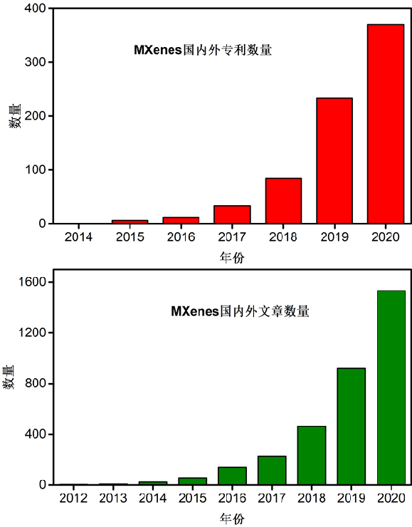 圖2 從“Web of Science”網(wǎng)站統(tǒng)計(jì)與MXenes相關(guān)的文章及國(guó)內(nèi)外專(zhuān)利數(shù)量