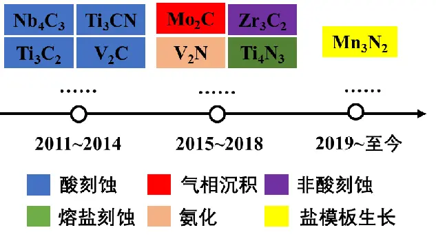 隨著MXenes家族的壯大,對(duì)MXenes材料的研究也日益增多。圖3羅列了發(fā)現(xiàn)MXenes材料的進(jìn)展的簡(jiǎn)要時(shí)間表??梢钥吹浇鼛啄闙Xenes材料的發(fā)展速度越來(lái)越迅速,并且可以從圖中看到制備MXenes材料的工藝流程也越來(lái)越豐富,逐漸從使用高毒性和高腐蝕性的HF溶液發(fā)展到通過(guò)熔融鹽、高溫堿溶液和電化學(xué)方法剝離等更豐富更綠色健康的方法和工藝[2]。