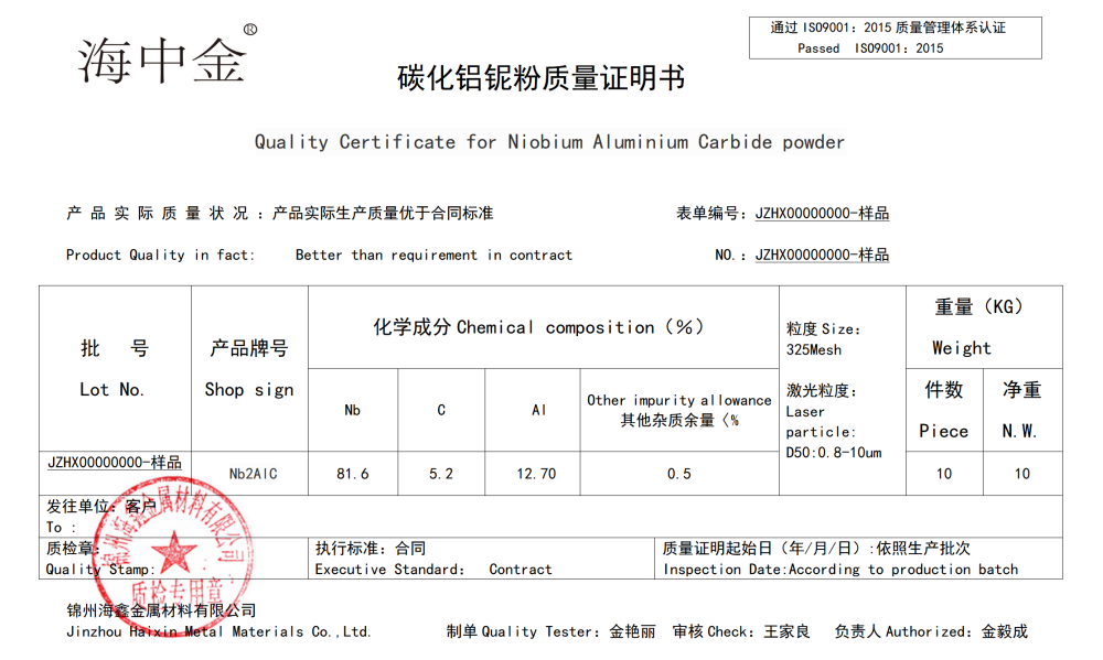 產(chǎn)品名稱:碳化鋁鈮(Nb2AlC)